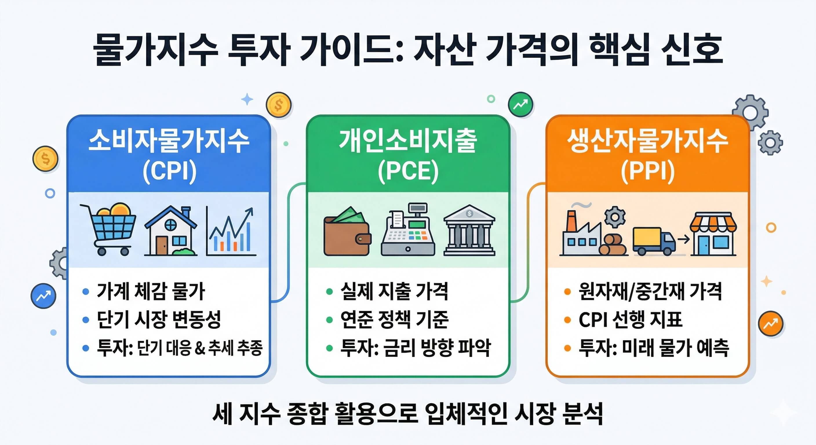 물가지수는 단순한 경제 뉴스가 아니라 자산 가격을 움직이는 핵심 신호다. CPI, PCE, PPI 각각의 차이를 이해하고 발표 시점과 시장 반응을 연결하면 금리 방향, 주식 흐름, 매매 타이밍까지 읽을 수 있다. 이 글에서는 세 가지 물가지수를 실제 투자 판단에 어떻게 활용하는지 구체적으로 정리해 보았다.