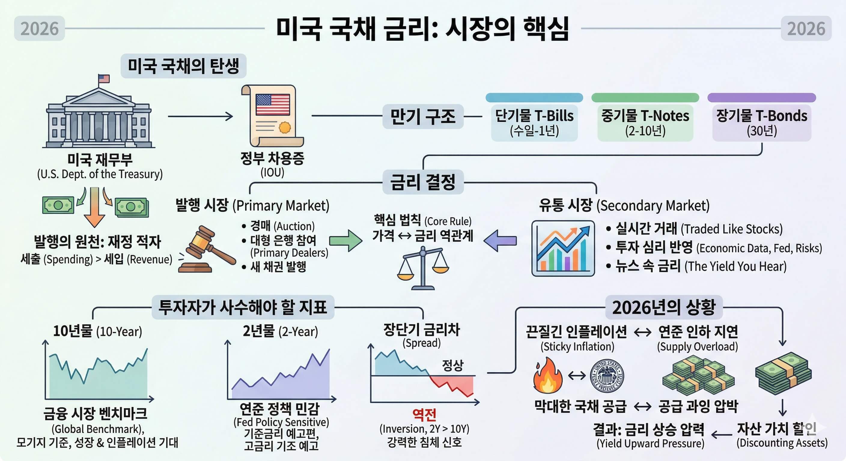 2026년 금융 시장의 중심은 단연 미국 국채 금리라 할 수 있다. 하지만 채권이나 금리는 투자자들에게 친숙하지 않은 대상이다. 국채의 기본적인 구조에 대한 이해가 부족하면 뉴스를 접할 때마다 알듯 말듯한 상태로 넘어가게 되는 경우가 많다. 국채 발행 주체부터 유통되는 마켓, 그리고 가장 주의 깊게 봐야 하는 부분까지 하나씩 짚어봄으로써 이런 장벽을 좀 더 낮춰보고, 더 나아가 현재 금융 시장의 흐름을 읽는 힌트를 얻어보고자 한다.