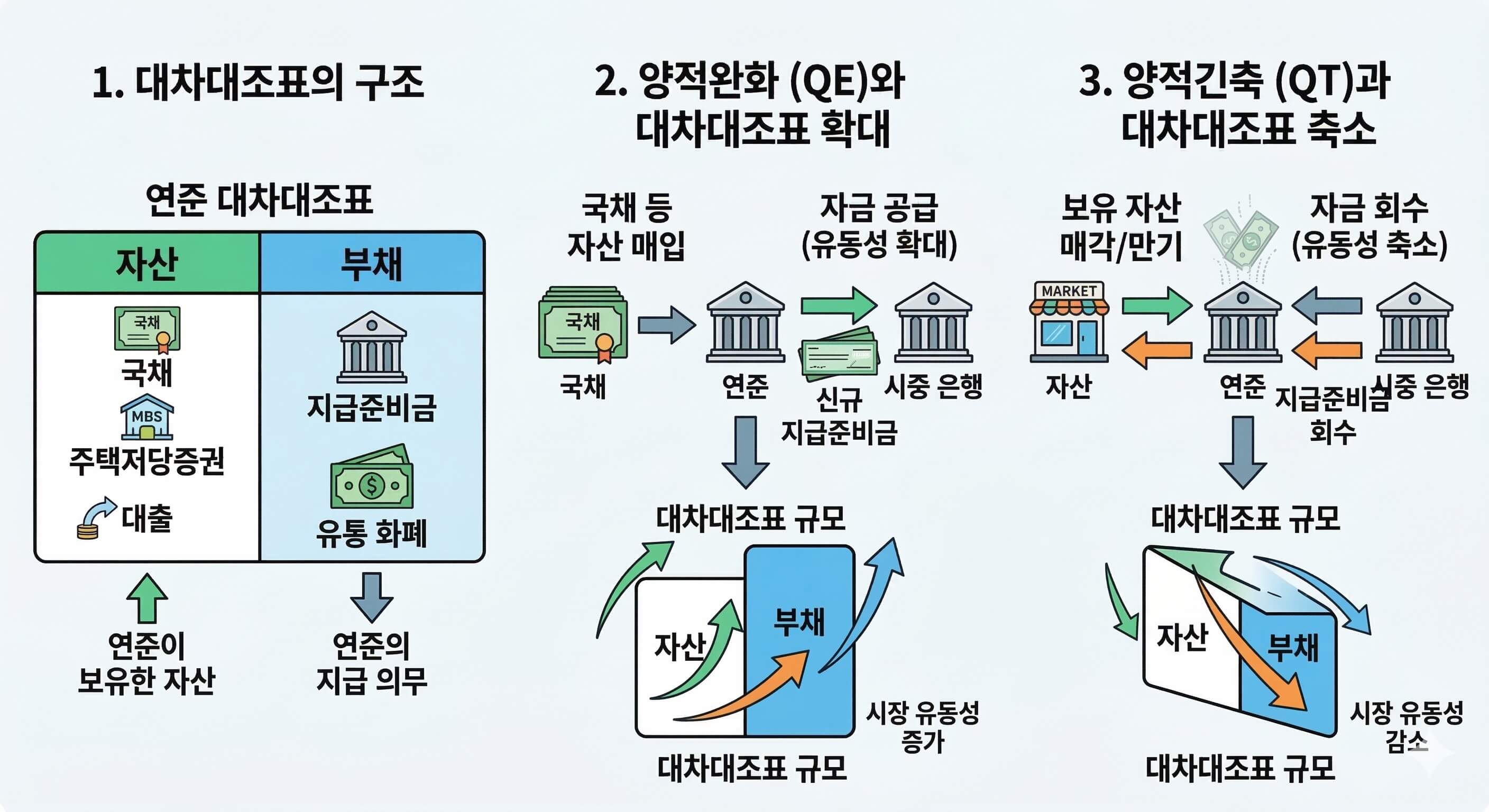 예를 들어 연준이 국채를 매입하면 그 국채는 연준의 자산으로 기록되고, 그 대가로 지급된 자금은 금융기관의 지급준비금 형태로 부채 항목에 기록된다. 이 과정에서 연준의 자산과 부채가 동시에 증가하게 되며, 결과적으로 대차대조표 전체 규모가 확대된다. 이러한 변화는 금융시장에 새로운 유동성이 공급되는 과정을 의미한다.