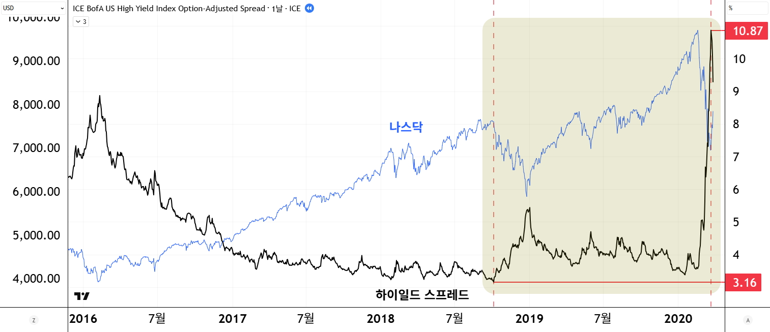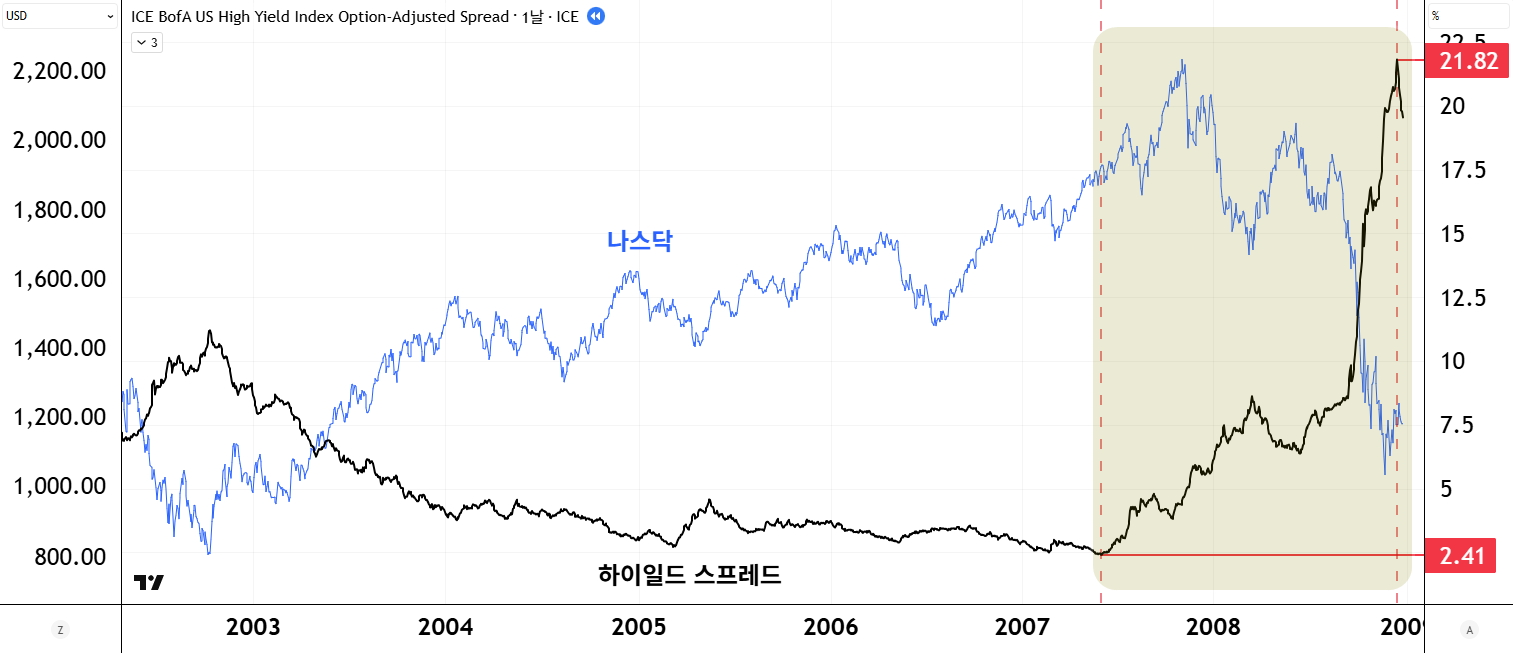 위 차트에서 검은색 선은 하이일드 스프레드를, 파란색 선은 나스닥을 나타낸다. 두 차트가 대체로 반대 방향으로 움직이는 것을 알 수 있다. 스프레드의 급등은 곧 나스닥의 급락을 의미한다는 것이다.