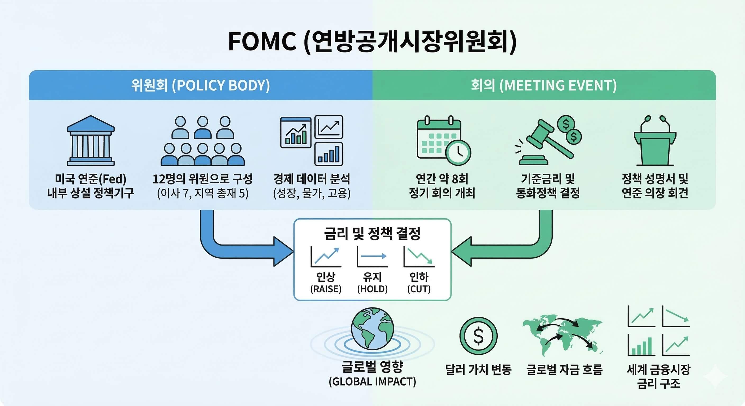 글로벌 금융시장에서 투자자들이 가장 주목하는 경제 이벤트 가운데 하나가 바로 FOMC(연방공개시장위원회)다. 금융 뉴스에서는 “FOMC가 금리를 인상했다”, “이번 FOMC 결과에 따라 시장이 크게 움직였다”와 같은 표현이 자주 등장한다. 이러한 표현 때문에 많은 사람들은 FOMC를 단순히 하나의 회의로 생각하기도 한다.